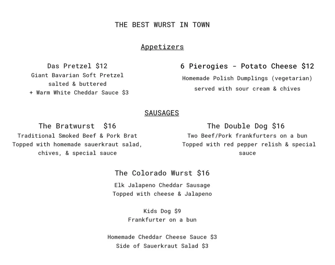 Established in 2022, our sausage mobile is an extension of our brick and mortar restaurant, Bohemian Biergarten, located in Downtown Boulder since 2013. “The Best Wurst in Town!”